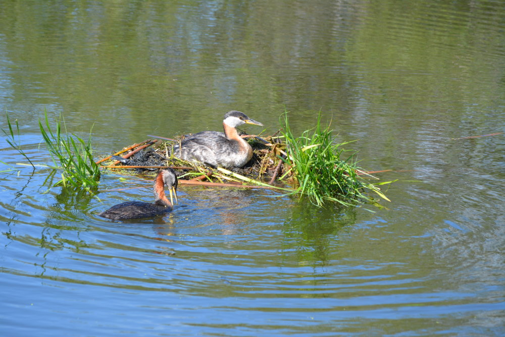The highlight of our birdwatching was the red-headed grebe couple nesting on a solitary mound a few feet from the floating boardwalk on Astotin Lake. The female was sitting on five speckled eggs and the male was busily reinforcing the nesting mound which was struggling to stay above the rising water resulting from all the spring rains.