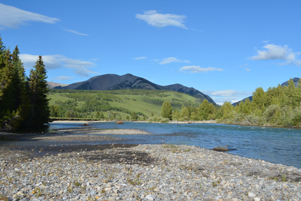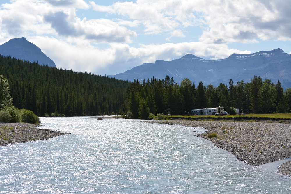 Because what Bighorn Campground lacks in amenities, it makes up for in scenery. It is heavenly out there. I kid you not. Rocky Mountains, less snow-covered and more weathered to the east than to the west, surround the ranch. The Red Deer River headwaters flow through its gravelly bar-strewn channel along the south boundary of the campground, while the Bighorn River, a smaller tributary, makes the western campground boundary.