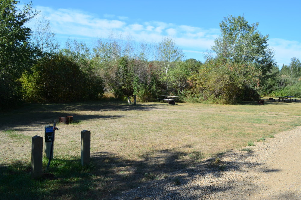 At the top end of the field is a gravel parking lot for visitors and a registration kiosk. Immediately to the west, the map shows a picnic area but in reality there isn’t much here. Instead, to the east, past three powered sites, there is what I would consider the true day use area.