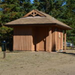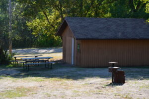 Campers were using this group area during our stay, so I wasn’t able to snoop around much or get a look inside any of the associated structures. The picnic shelter looked nice from the outside and is fully enclosed with a tall stovepipe chimney indicating the presence of a woodstove.