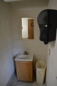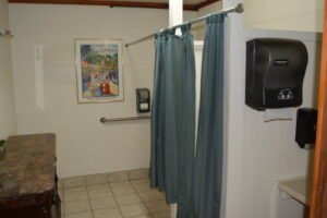 The campground bathroom and showers were a bit tricky to find at first. They’re located at the back of the office structure and there’s no obvious signage indicating as much. Even when approaching from the interior field, the pool fencing blocks evidence of the bathroom entrance.