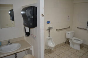 The main bathroom entrance leads to a short hallway with women’s facilities to the right and men’s to the left. Each sex has two options: a bathroom and a shower room.