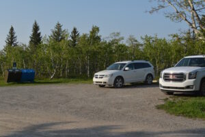 Campsites have the typical Alberta Parks setup with a gravel drive for RVs and vehicles. The gravel pad bumps out around the expected steel firepit with partial grate and well-worn wooden picnic table. There was plenty of room for our Geo Pro and Pathfinder. Larger rigs will easily fit this site.