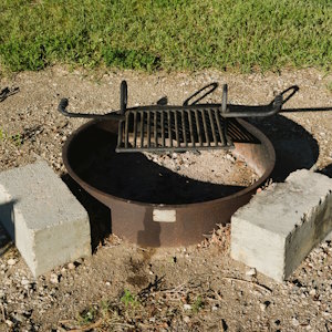 A log fence separates the driveway from the loop interior where the campsite amenities are located. This fence has one open segment allowing users to enter their campsite, typically by the immovable picnic table. A low-profile firepit with a flippable grill is also found at each campsite.
