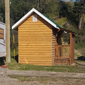 The office building is made of shaped logs with a covered porch out front. Multiple blooming flower baskets make for a welcoming presentation. It’s located immediately across the road from the bathroom/shower building.