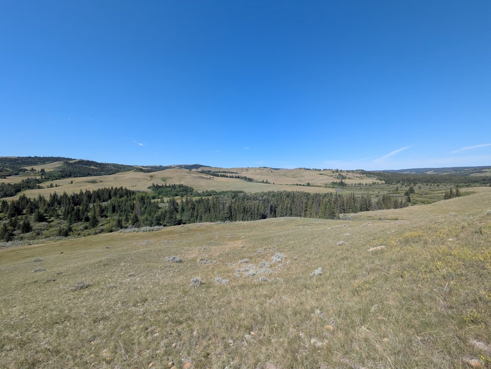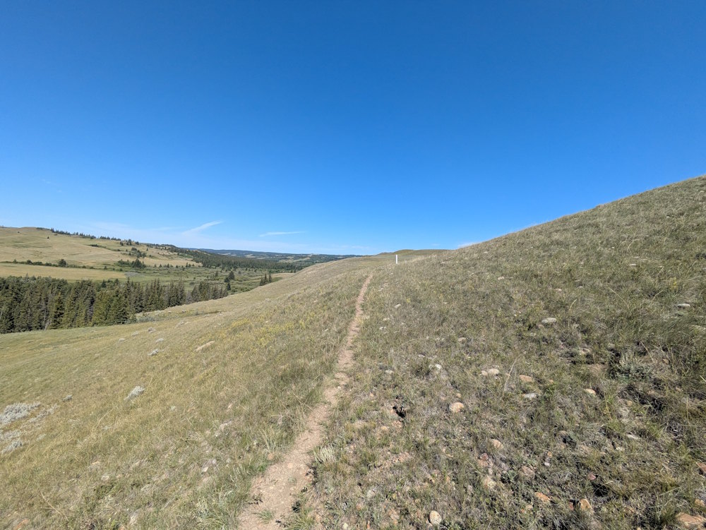 This is easily the best part of the hike and all the reason needed for doing it. The ridge provides wonderful, unobstructed views of the to the west. The Cypress Hills are an oasis in an otherwise harsh prairie landscape and seeing them from this vantage point left me both pleased and introspective. I wonder if the horseback riders we saw in the distance felt likewise.