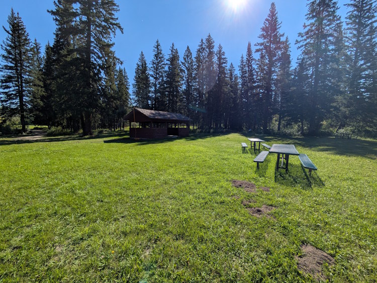 A wooden, open-air picnic shelter dominates the area. Several picnic tables are available, somewhat ironically all positioned in the grass outside the picnic shelter. When we were there in 2025, only a couple park benches and a garbage can remained inside the shelter. Kind of backwards, if you ask me.