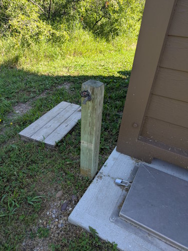 Water taps are located beside both the picnic shelter and the pit toilet. These, in part, are used to water the grass and keep the shelter moist during the hot summer. Similar measures are used at the fort to help limit any damage should wildfires threaten.