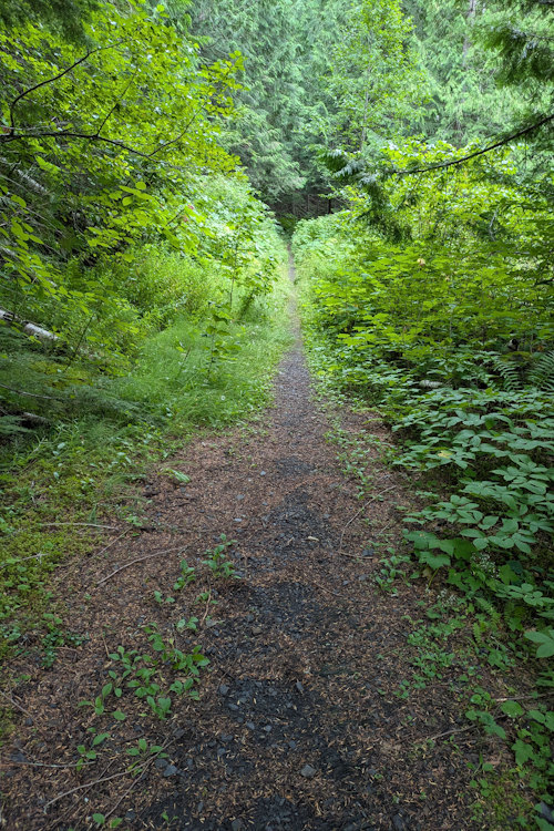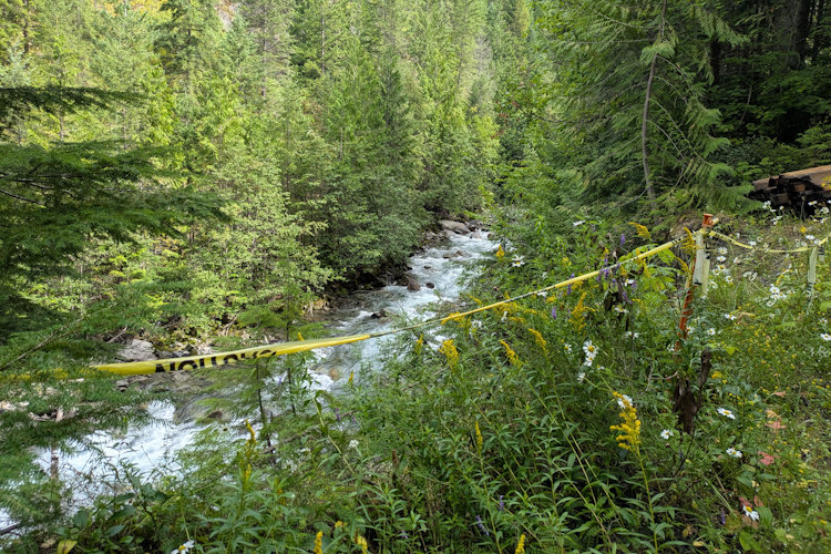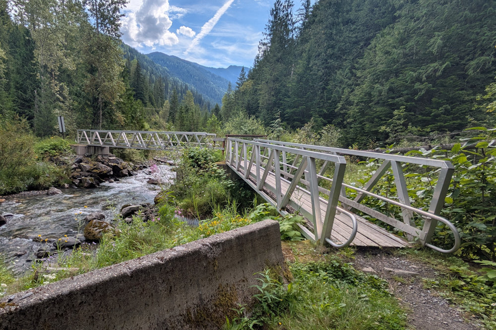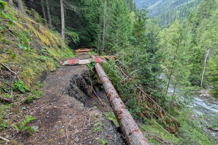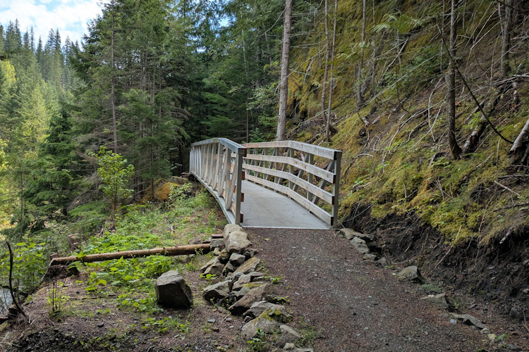 In one instance, we could see up the trail to the cause of the closure. It appeared to be bridge construction where rivulets crossed the trail. Others, we would learn, were the result of small landslides that had given way down to Carpenter Creek. Typically, these were wood bridges but there was also one instance of a metal bridge like the one at the trailhead.