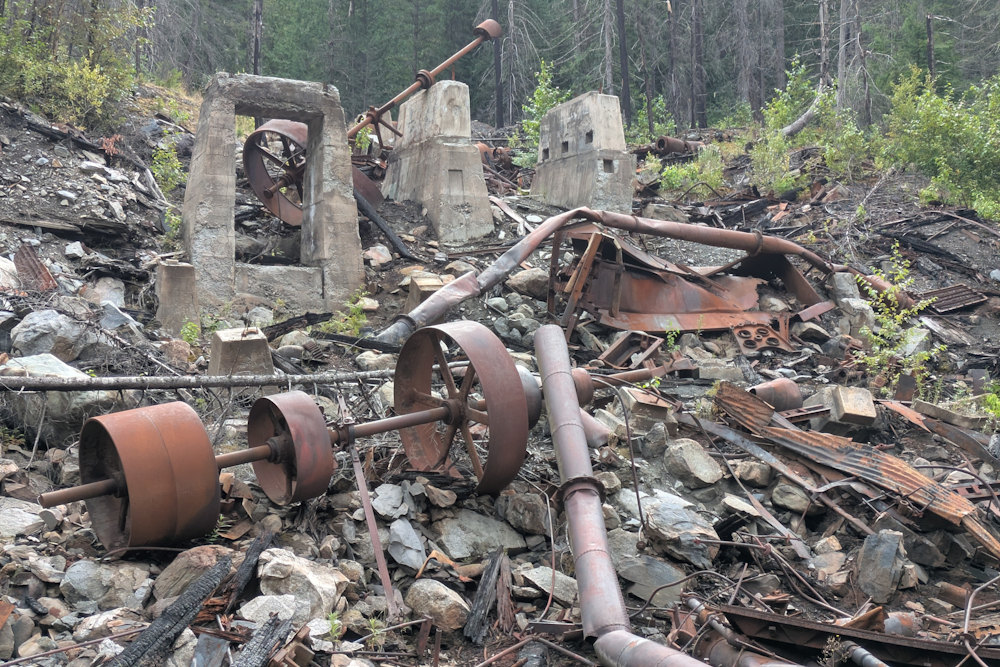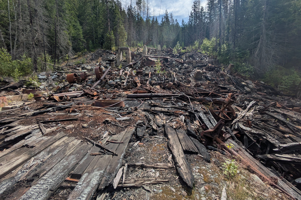 Today, torched timbers, rusted metal, and exposed concrete foundations of the once mighty concentrator mill are all that is left of Alamo Siding. And while I would have loved to see the collapsed structure before it burned to the ground, the site remains a fascinating ruin to explore, albeit carefully.