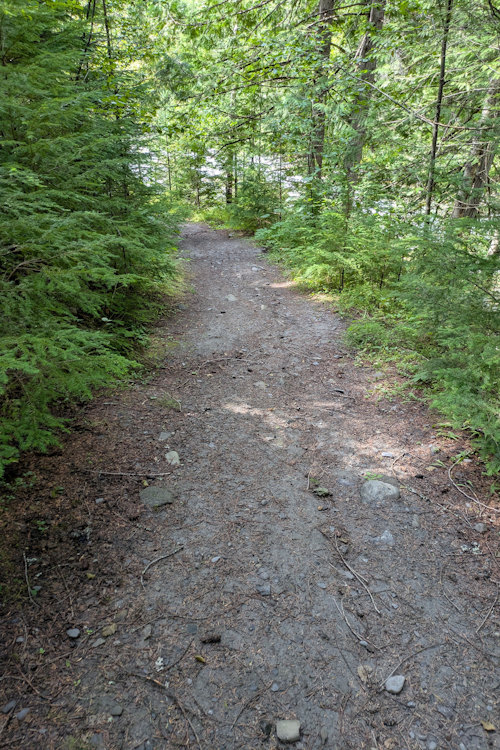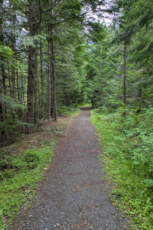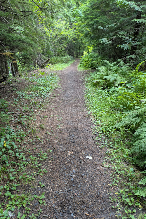 Galena Trail is almost entirely bare forest floor but with little in the way of tree roots. It is comfortably wide allowing side-by-side walking or easy passing of oncoming hikers. It’s also fairly straight and very level, not surprising considering its railroad origins. The flat terrain is excellent for those wanting (or needing) a more leisurely hiking experience.