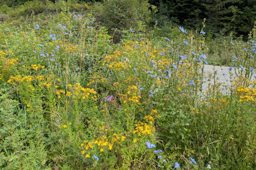 Galena Trail begins approximately 65m down the road from the parking lot. A gravel path lined with wildflowers and weeds passes beneath an arching trailhead sign and then into a patch of woods. It quickly crosses over Carpenter Creek via a metal bridge, turns to dirt and heads into the main forest.