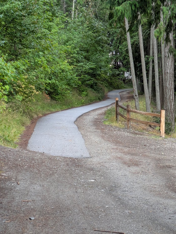 But road it is, despite the odd half-asphalt/half-gravel configuration. Descending the modest slope, it takes you to a gravel parking lot with room for perhaps ten cars.