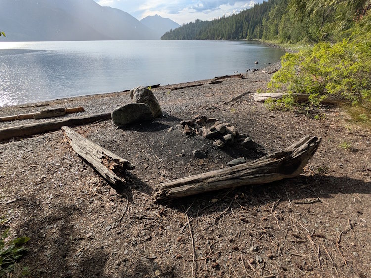 A deeper segment of the beach hosts driftwood and boulders around a pile of ashes and stones indicating that beach bonfires occur here. No idea how “legal” this is but it looks like it would be fun with a group of friends.