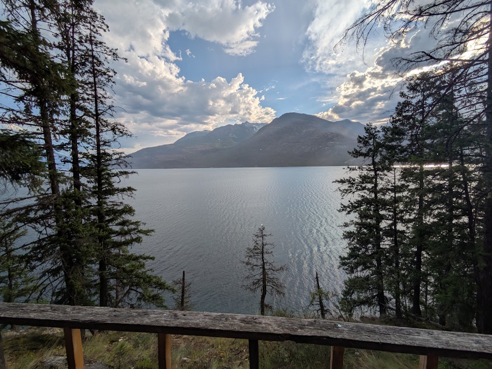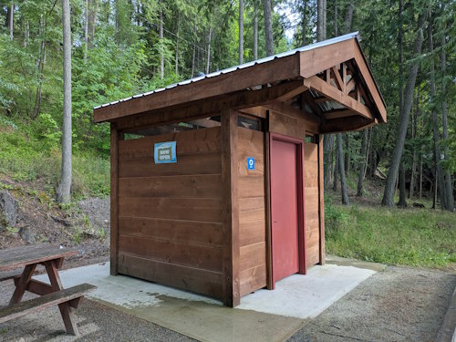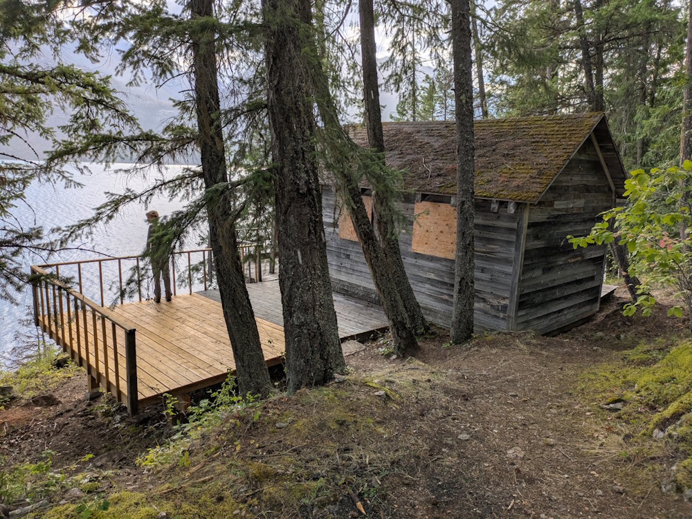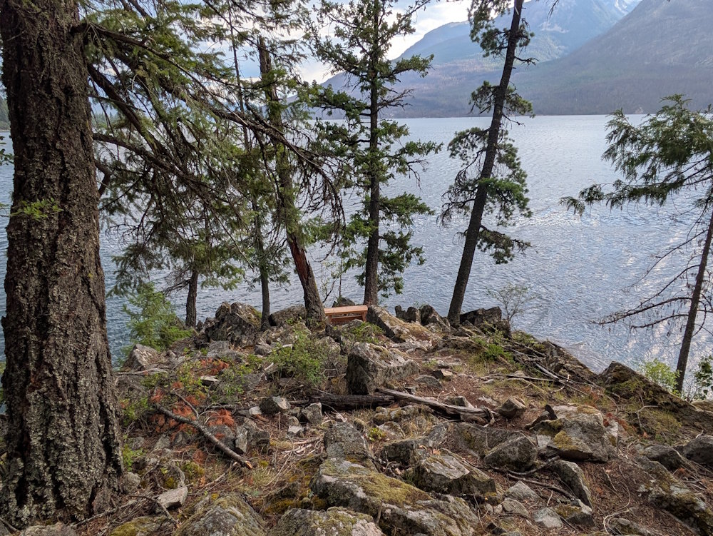 Below the pit toilet is a viewing platform, also new. The park bench situated here provides a lovely view of the beach and Slocan Lake to the north.