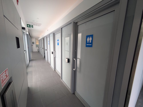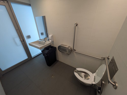 Immediately to your right after entering the south entrance, you’ll find the restrooms. There are several (5 I think?) and they appear to be a recent addition. Each are accessible, unisex bathrooms with sink and toilet.