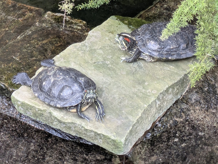 Arguably the coolest part of this house is the water feature and turtles that live in it. We found two of them chilling on a stone near the waterfall wall.