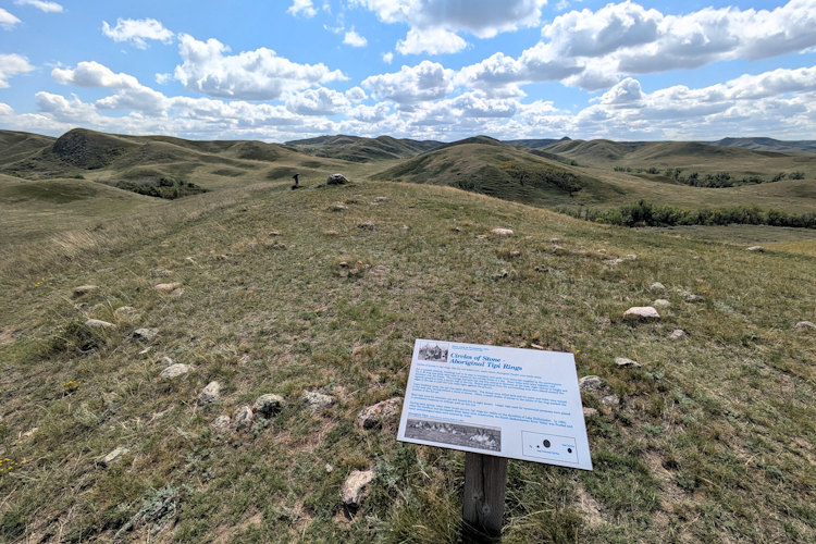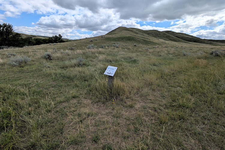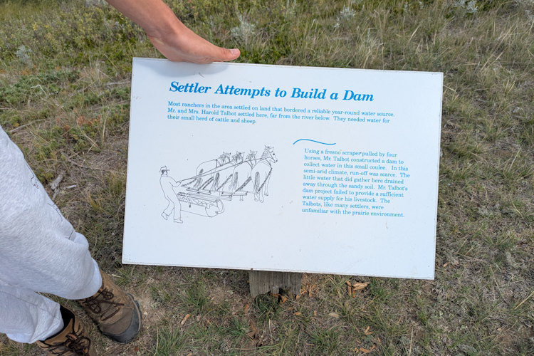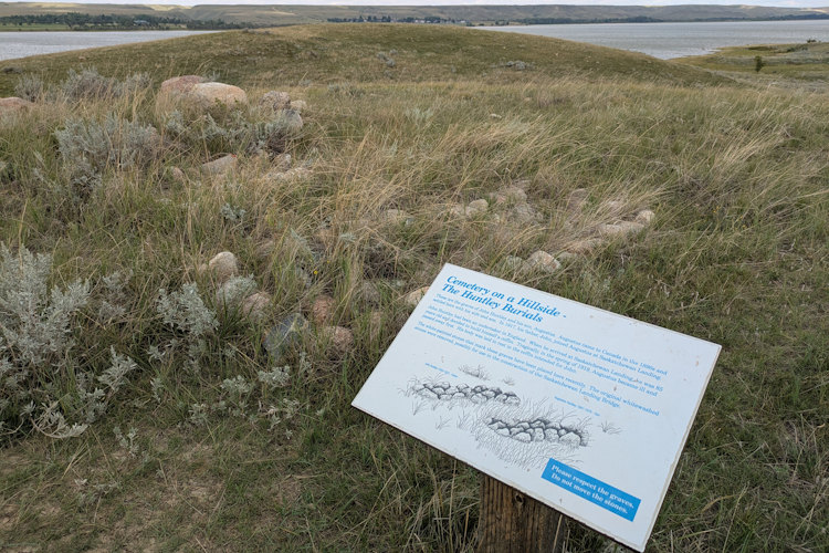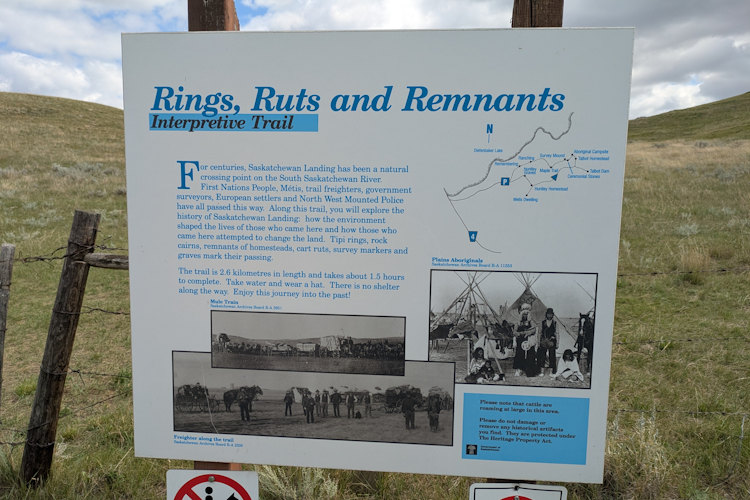 The first point of interest we encountered is the gravesite of two early settlers at Saskatchewan Landing. Consisting of a pair of elongated stone mounds on a slight rise, you wouldn’t necessarily recognize it as such without foreknowledge or the accompanying signage. Always a heavy experience standing over old burials.