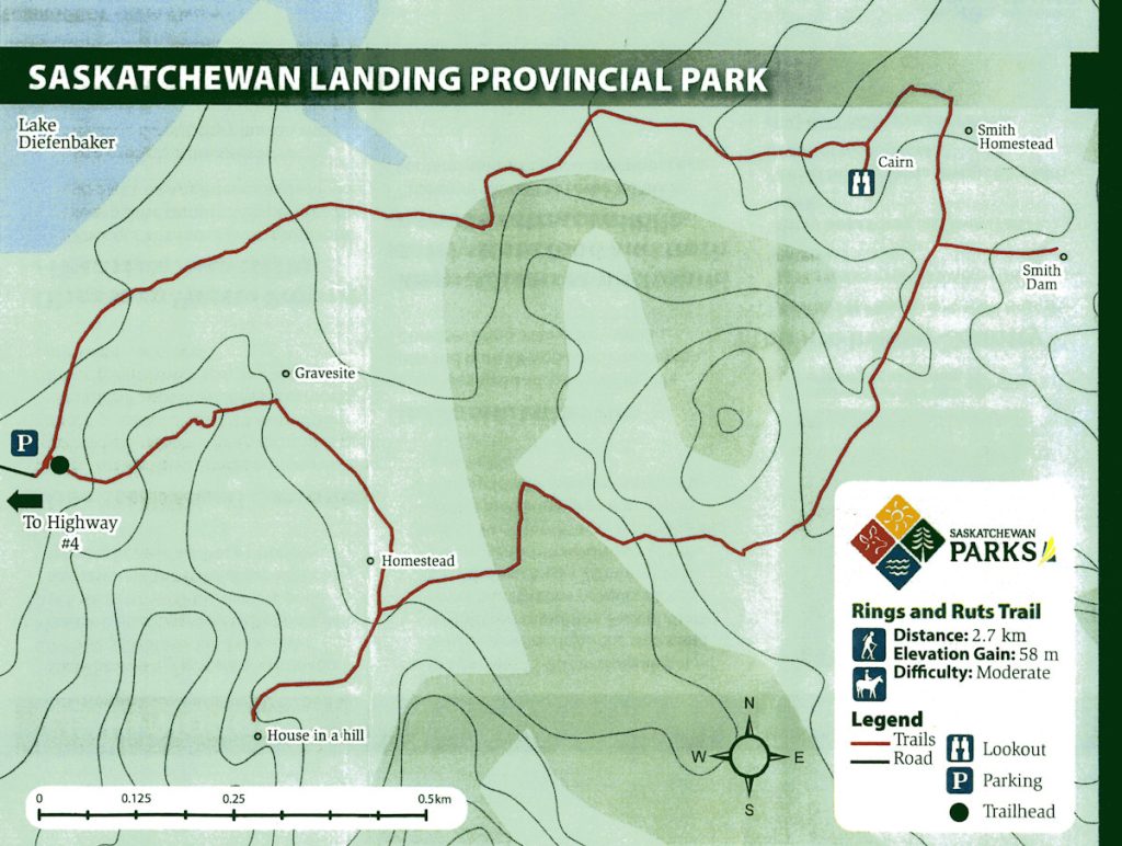 The three of us did fancy a hike, however, and we settled on the Rings Ruts and Remnants Trail for our little adventure. At 2.7km in length, it landed in our Goldilocks zone, not too short (Ridges and Ravines Trail is 1.15km) and not too long (Prairie Vista Trail is 3.5km). Having the most points of interest along its path (six in total) didn’t hurt either.