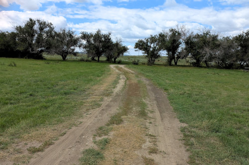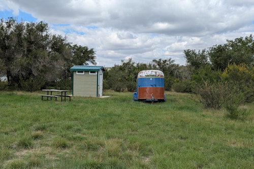 The field path follows the lake’s shoreline before heading inland as it approaches the trailhead parking lot. Just beforehand, it passes an old horse trailer, lone picnic table, and what I thought was a pit toilet. I attempted to look inside, but it was locked up tight and I’m now unsure what it really is.