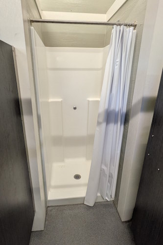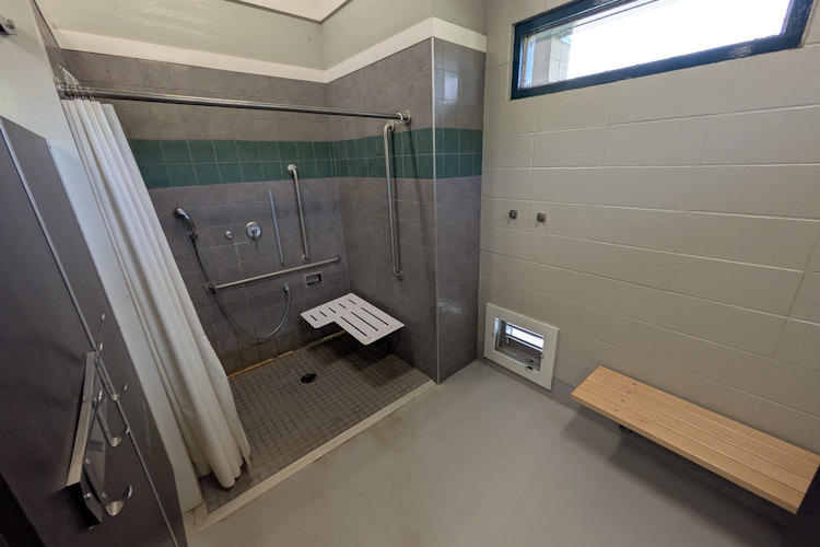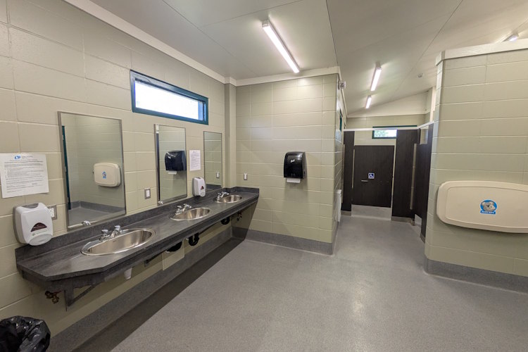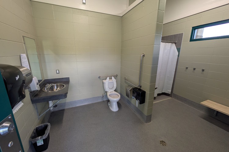 Nearly identical to every other shower house in Saskatchewan Landing Provincial Park, it has multiple sinks, mirrors, a change table, urinal, and several toilet stalls including an accessible one. Likewise, there are multiple shower stalls present including a large, accessible one with handrails and benches. Each shower stall also has a bit of space for changing, though the non-accessible ones are quite cramped.