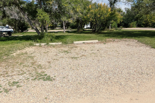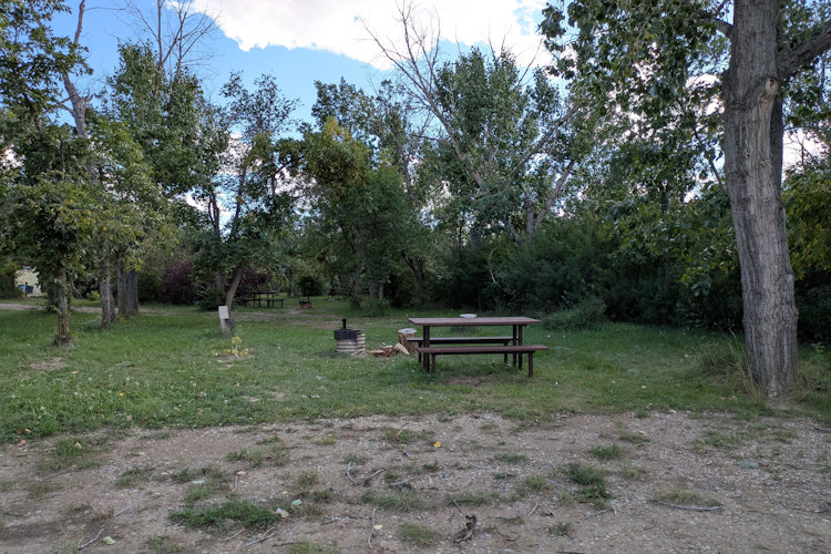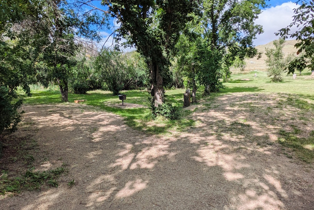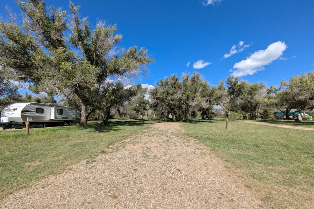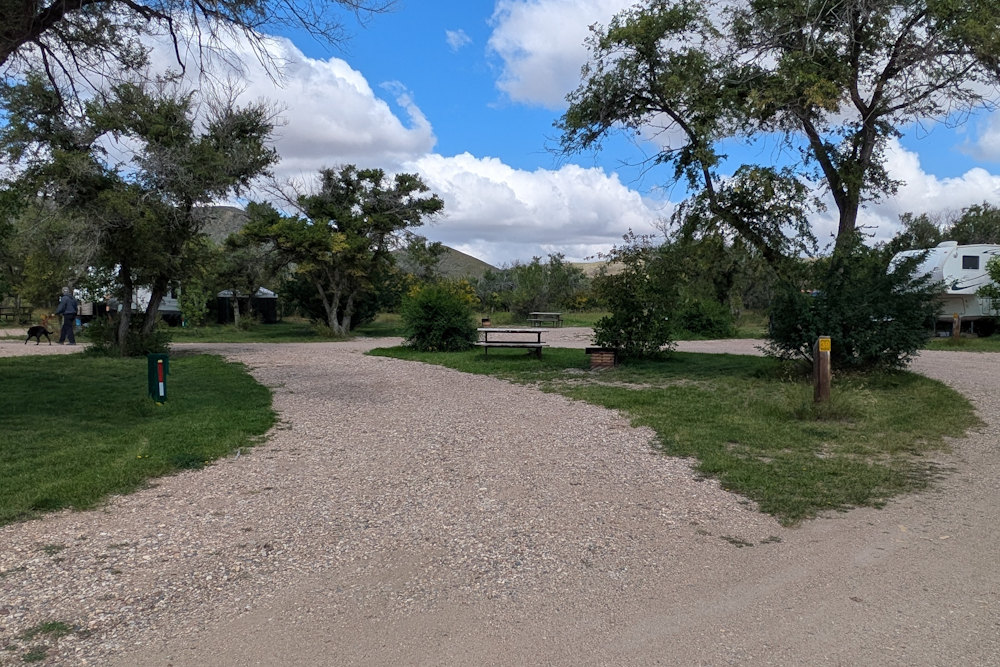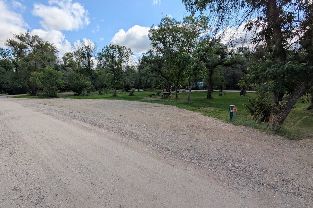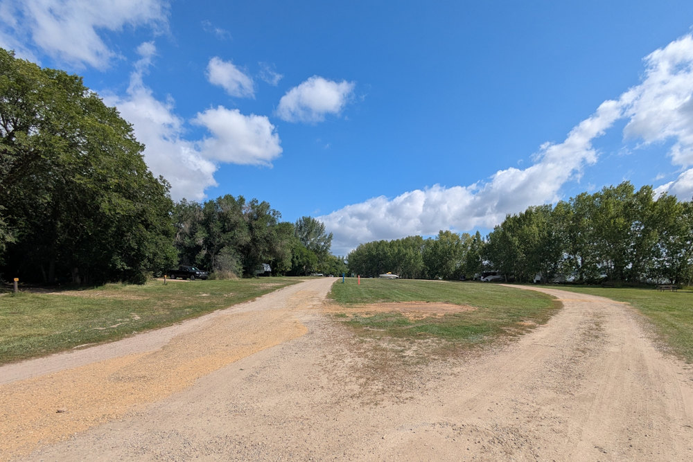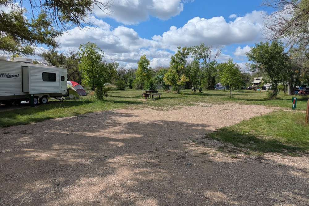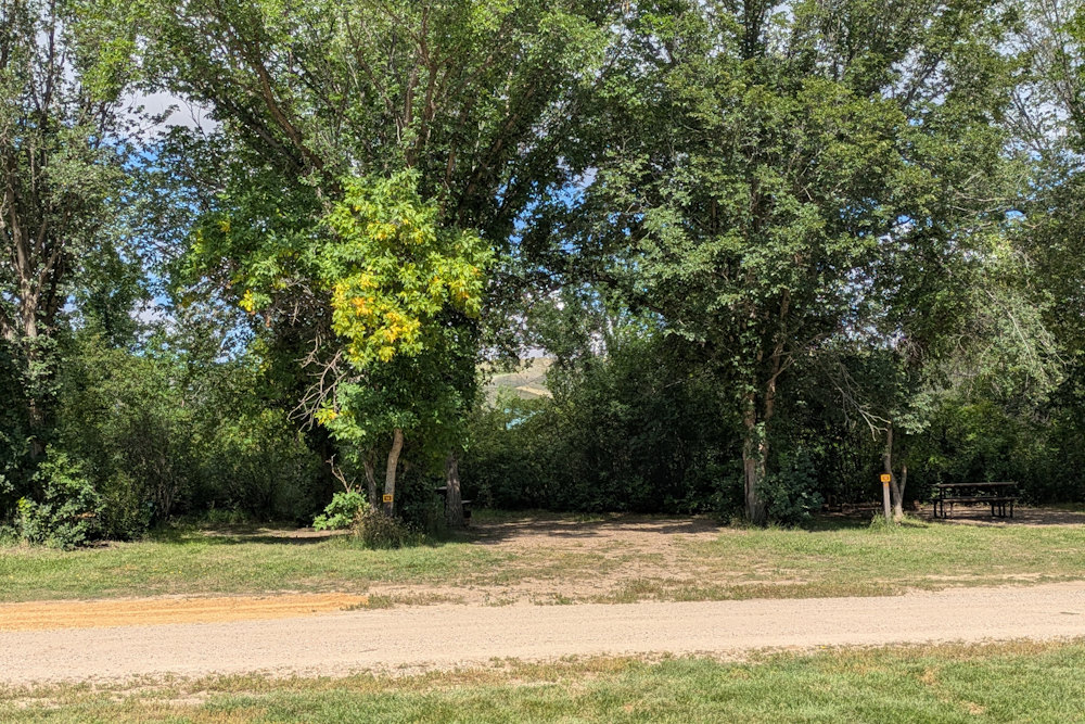 Each campsite has a gravel driveway; many are angled to the loop road for easier backing into. Between campsites there is decent, unexpectedly green grass. Ratty poplar or cottonwoods dot the loop providing partial shade on most sites. A few of the are almost barren if you prefer sunshine, but the rest offer a nice compromise between sun and shade.