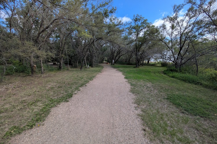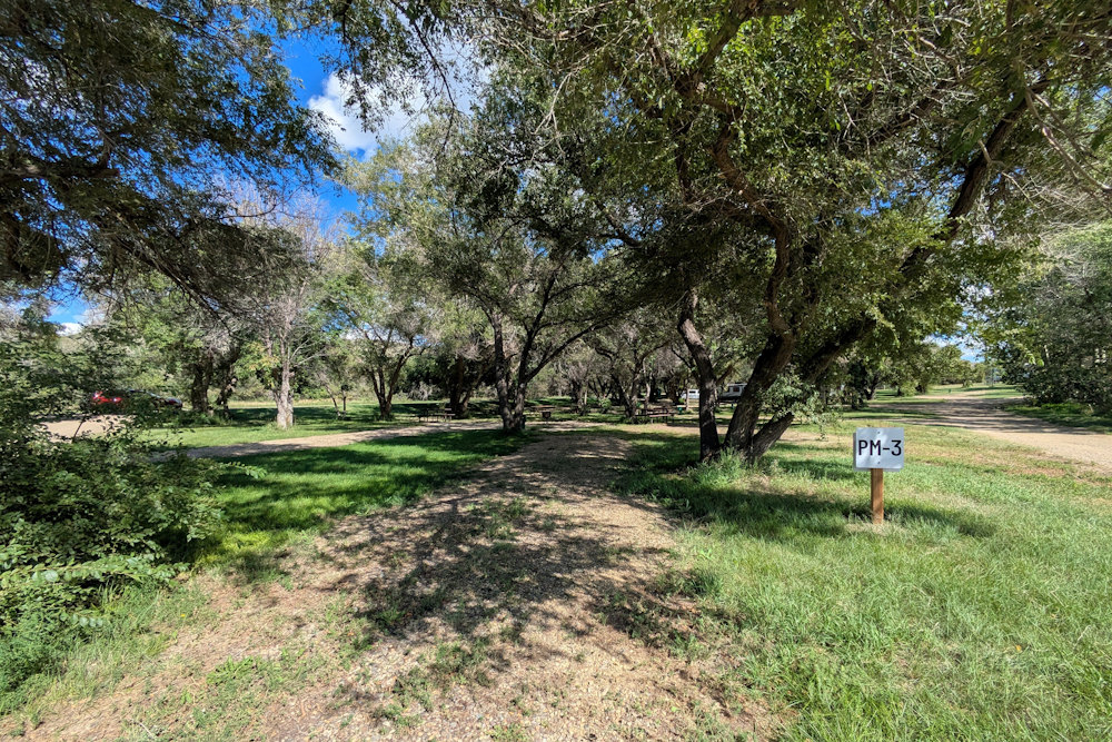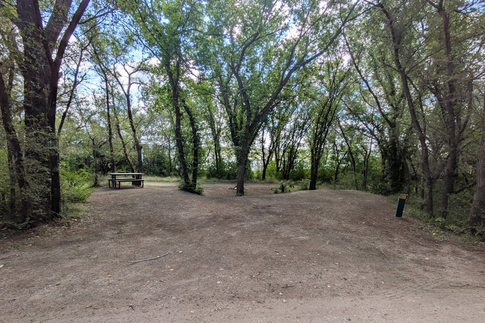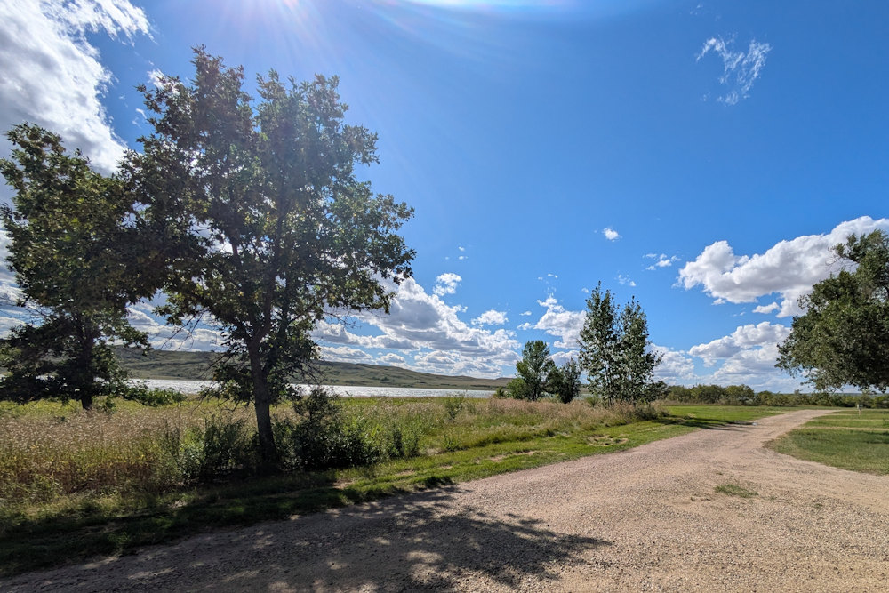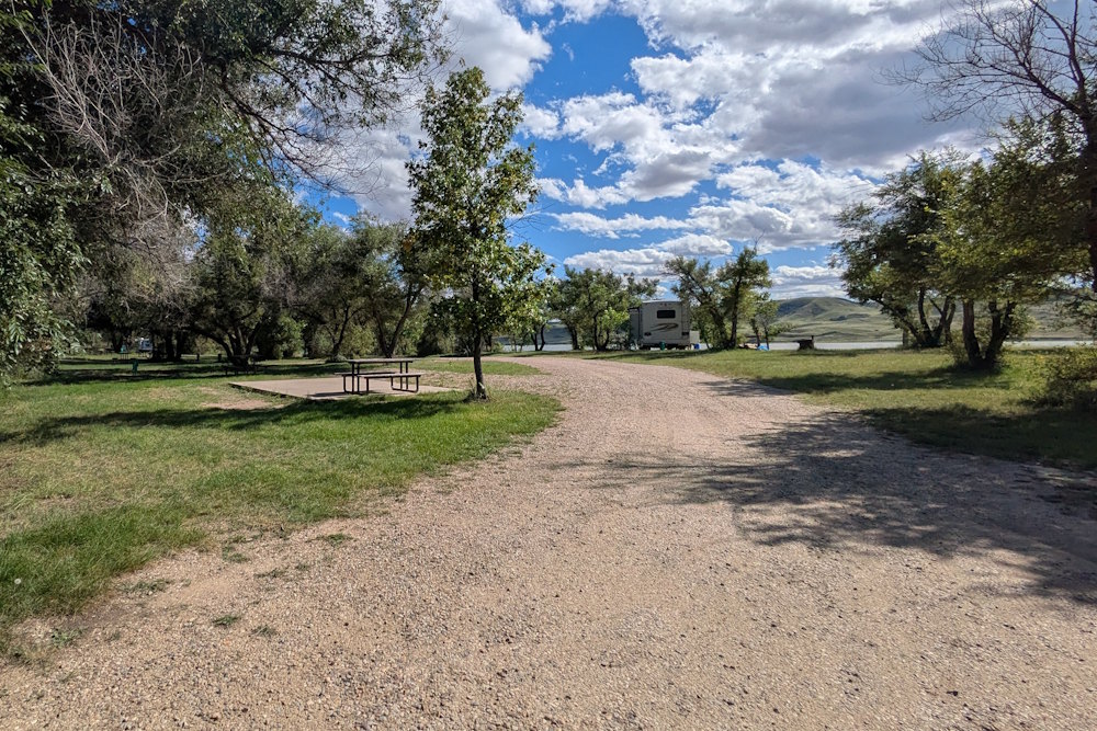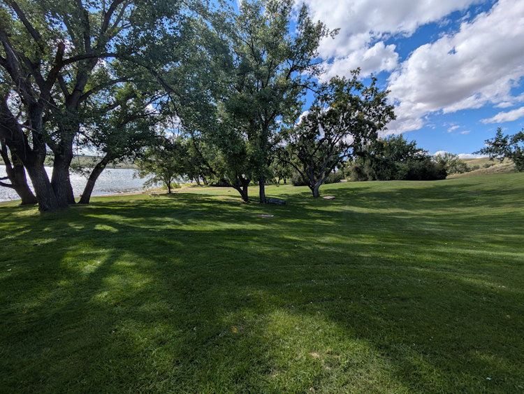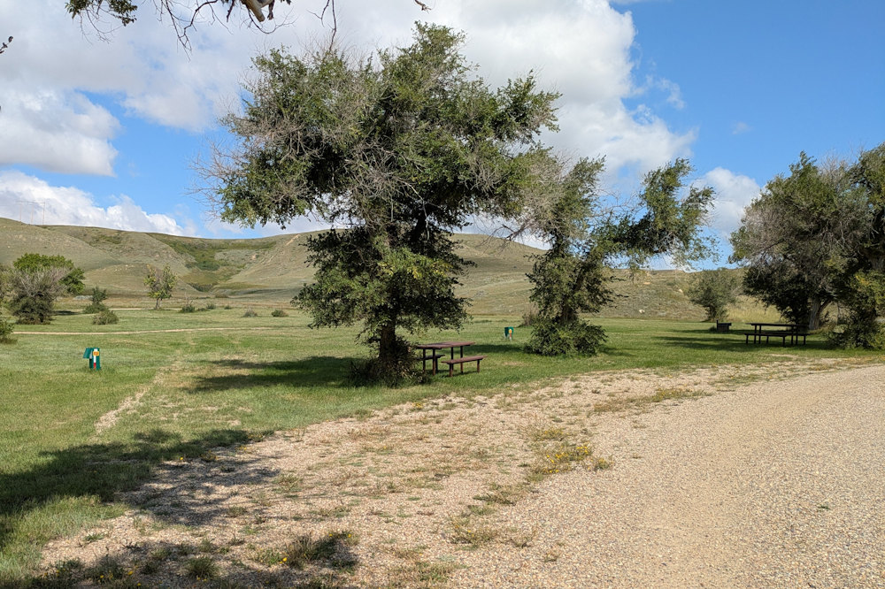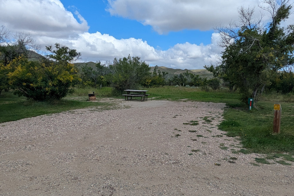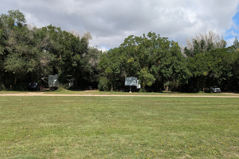 Each campsite has a gravel driveway; many are angled to the loop road for easier backing into. Between campsites there is decent, unexpectedly green grass. Ratty poplar or cottonwoods dot the loop providing partial shade on most sites. A few of the are almost barren if you prefer sunshine, but the rest offer a nice compromise between sun and shade.
