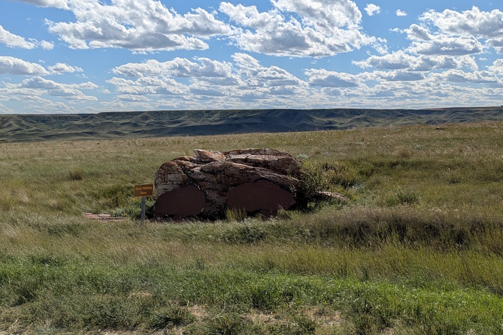Buffalo Rubbing Stone is a modest attraction found along a range road heading north of the park road in the northwest side of the park. The large erratic is roughly 300m from the park road. It’s easily viewable from the range road so there’s no real need to get out of your vehicle. You can stroll through the grass if you really want to get a close look at it. We chose to simply take a quick gander out our vehicle windows.