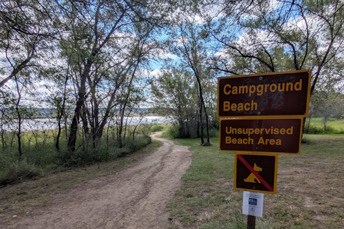 Accessing Campground Beach is done via a trail extending from Bearpaw campground roads. There’s an ATV trail heading there as well. In the easterly direction, this trail takes you to the green space play area that is part of Bearpaw Campground. A single foot washing station is located at the trailhead to the beach.