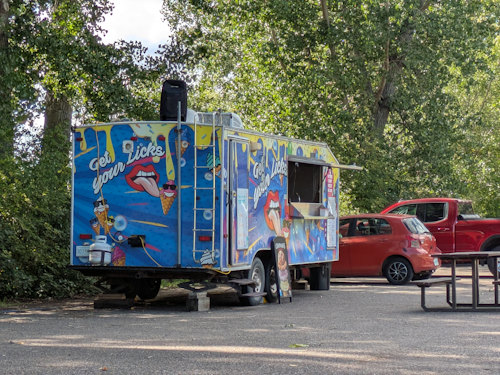 If you’re lucky, and feeling the heat, an ice cream treat trailer was set up in one of the parking lots when we were snooping around. I’m sure that place is hopping on hot weekends. I didn’t notice any other food or beverage offerings at Cottonwood Beach. There are many picnic tables in the grass among the big Cottonwood trees, great for anyone bringing their own supplies to have a picnic.