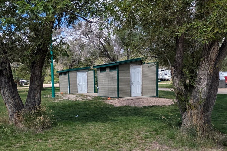 Instead of an internalized service area with sinks, toilet stalls, and showers this structure has individual bathroom and shower facilities each accessed from the exterior. Some have toilets and sinks only while others include a shower stall. Still useful and welcome but a different vibe from their newer counterparts.