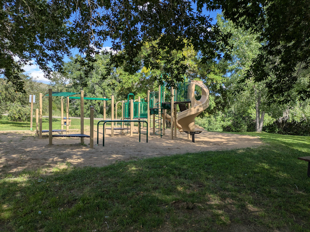 Now for peculiarities. The south-central portion of Sagebrush Campground is a bit odd. It’s an extension of the campground with the same trees and shrubs but without any campsites. What it does have is a playground to the west and a picnic shelter to the east.