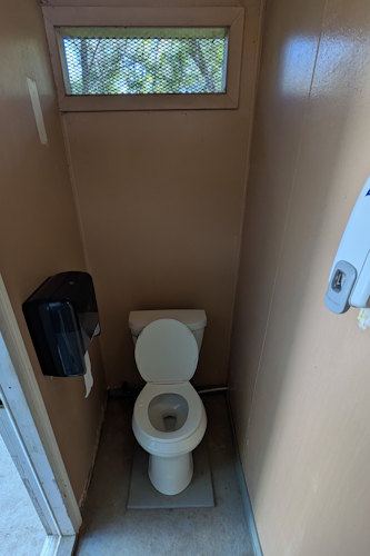 Riverside Campground has two options for hygiene requirements. Right about the centre of the campground, on the water side of the main road, are two bathrooms. These dual huts contain a flush toilet in each stall and little more. Lovely that they are not pit toilets, but the lack of a sink is a bit disappointing.